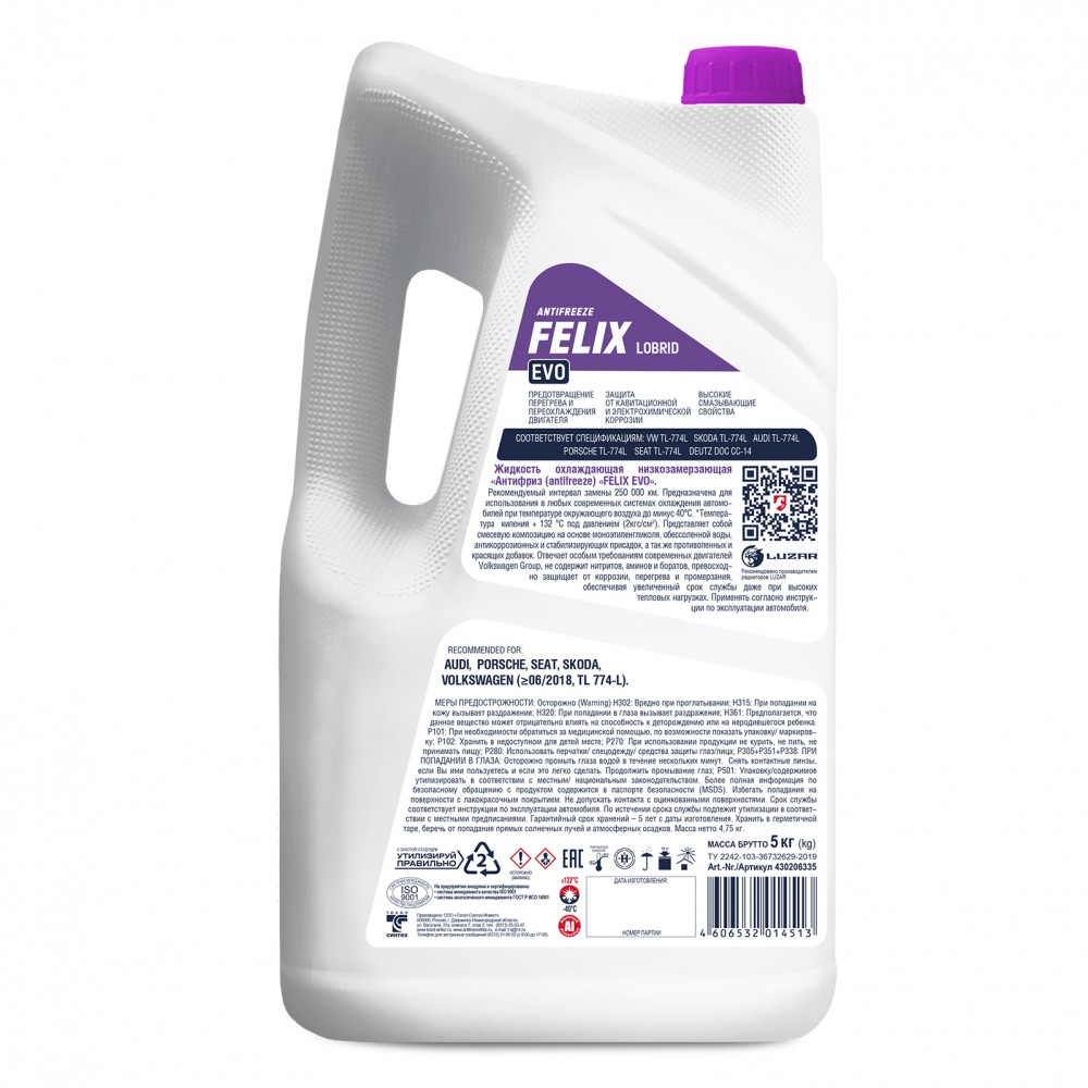 Felix EVO 5л (фиолетовый) Антифриз это профессиональная охлаждающая жидкость премиум-класса, разработанная по лобридной технологии (Psi-OAT) специально для современных высоконагруженных двигателей. Продукт идеально подходит для автомобилей концерна Volkswagen Group и полностью соответствует их строгим требованиям.